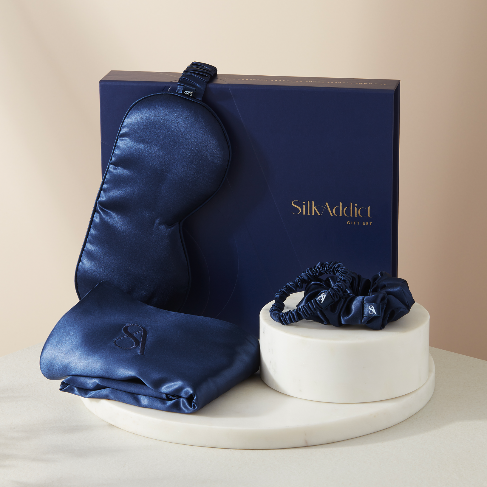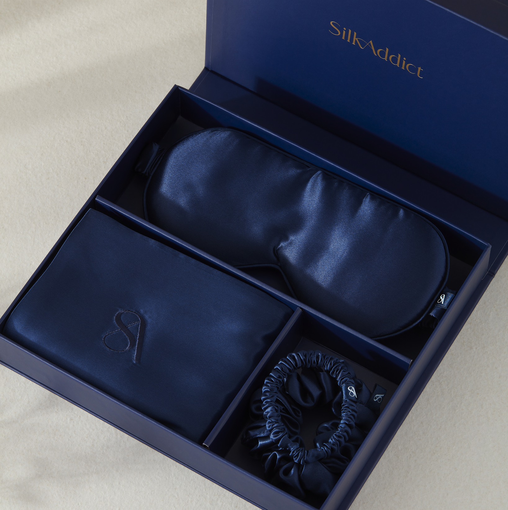 Experience unparalleled relaxation with our deluxe gift set, specially designed to elevate your beauty sleep regime. This carefully curated collection includes our top-selling trio, elegantly packaged in a beautiful box, making it an ideal indulgence for yourself or a cherished gift for someone special. Featuring a 22-momme mulberry silk sleep mask for complete darkness and lash protection, our classic silk pillowcase to keep skin smooth and hydrated, and a gentle silk scrunchie to prevent breakage and kinks.