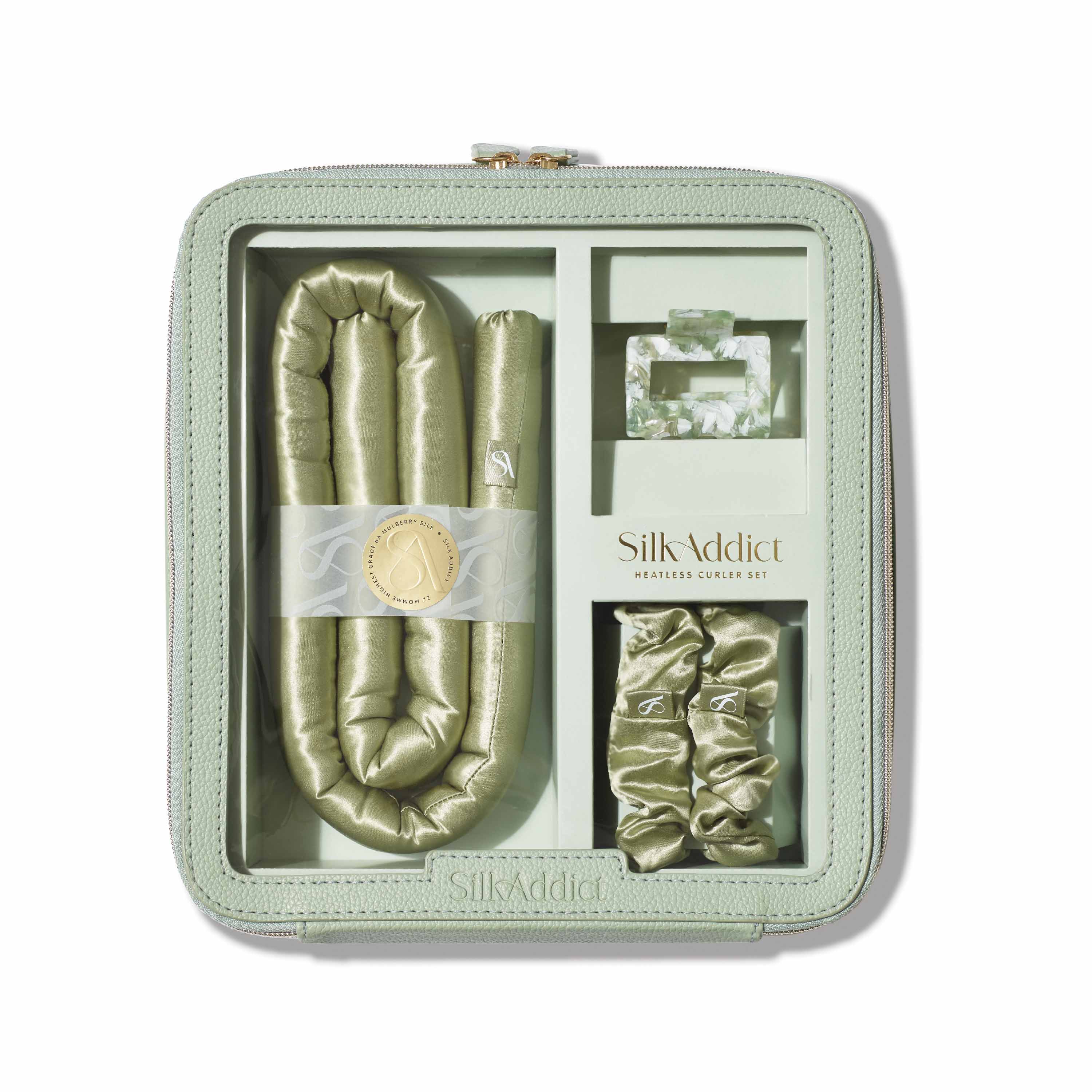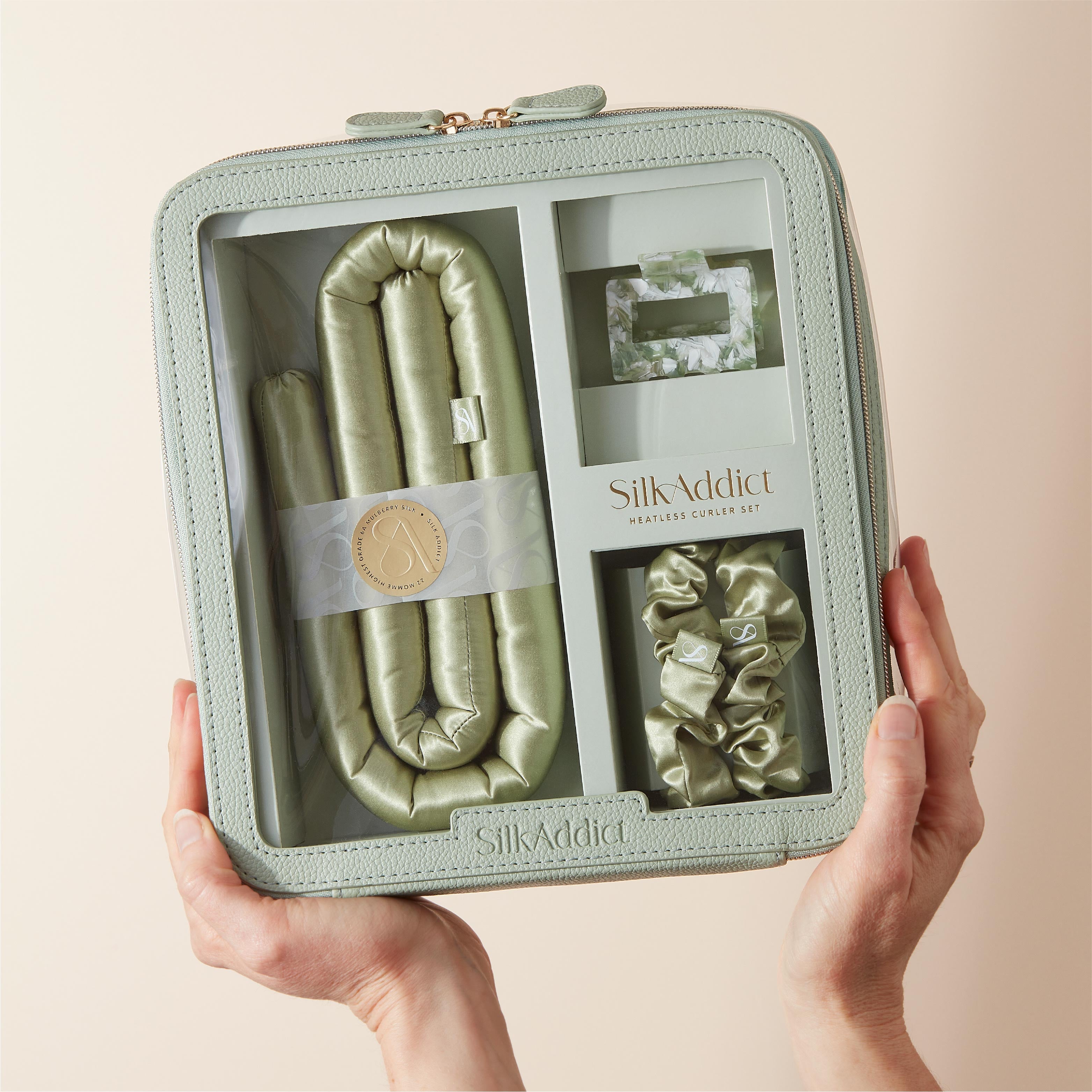 • Set includes: 1x silk curling rod, 1x clip, 2x silk scrunchies, 1x luxe travel bag.